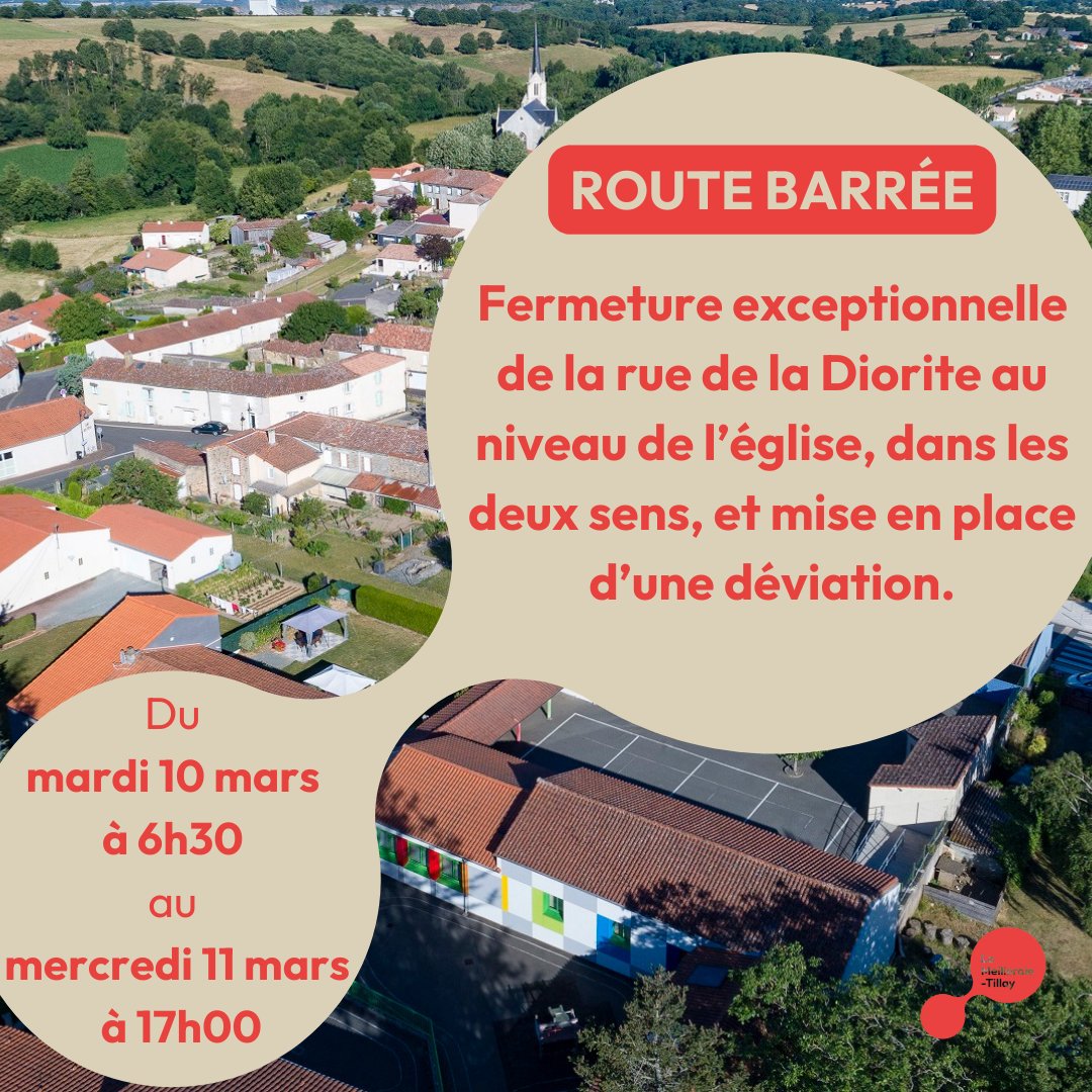 Fermeture exceptionnelle de la rue de la Diorite au niveau de l'église, dans les deux sens, à partir du mardi 10 mars 6 h 30, au mercredi 11 mars 17 h 00, pour l'enlèvement du clocher.
