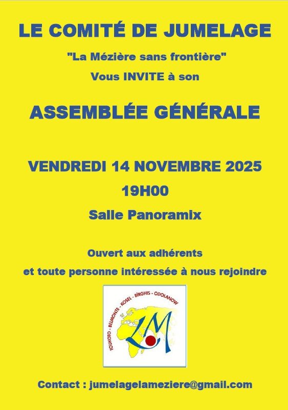 L’assemblée générale du comité de jumelage La Mézière sans Frontière se tiendra le 14 novembre salle Panoramix à 19 h.