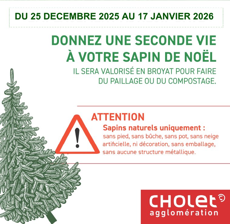 Pour être acceptés, les sapins doivent être débarrassés de tout élément non naturel : pas de pied, bûche, pot, neige artificielle, décoration ou emballage. Les sapins seront broyés et réutilisés pour enrichir les composteurs collectifs ou entretenir les espaces verts. Cette démarche s’inscrit dans les engagements du Plan Climat Air Énergie Territorial (PCAET) de Cholet Agglomération