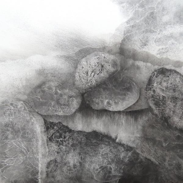 Pour obtenir de la « poudre de charbon », elle ponce des fragments sur du papier de verre. Elle laisse tomber la poudre directement sur le papier sur lequel elle dessine. Puis divers gestes (estompage, frottage, empreintes…) lui permettent de travailler directement dans cette matière pulvérulente.