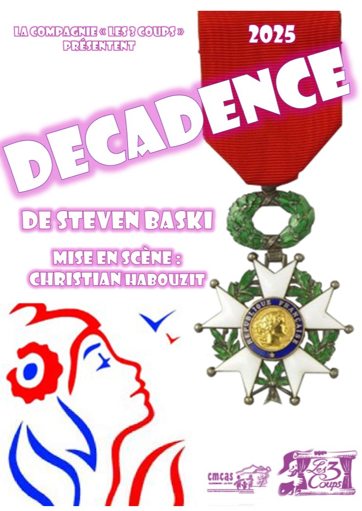 Venez applaudir la compagnie Les 3 Coups qui vous présentera la comédie « Décadence », écrite par Steven Baski et mise en scène par Christian Habouzit.