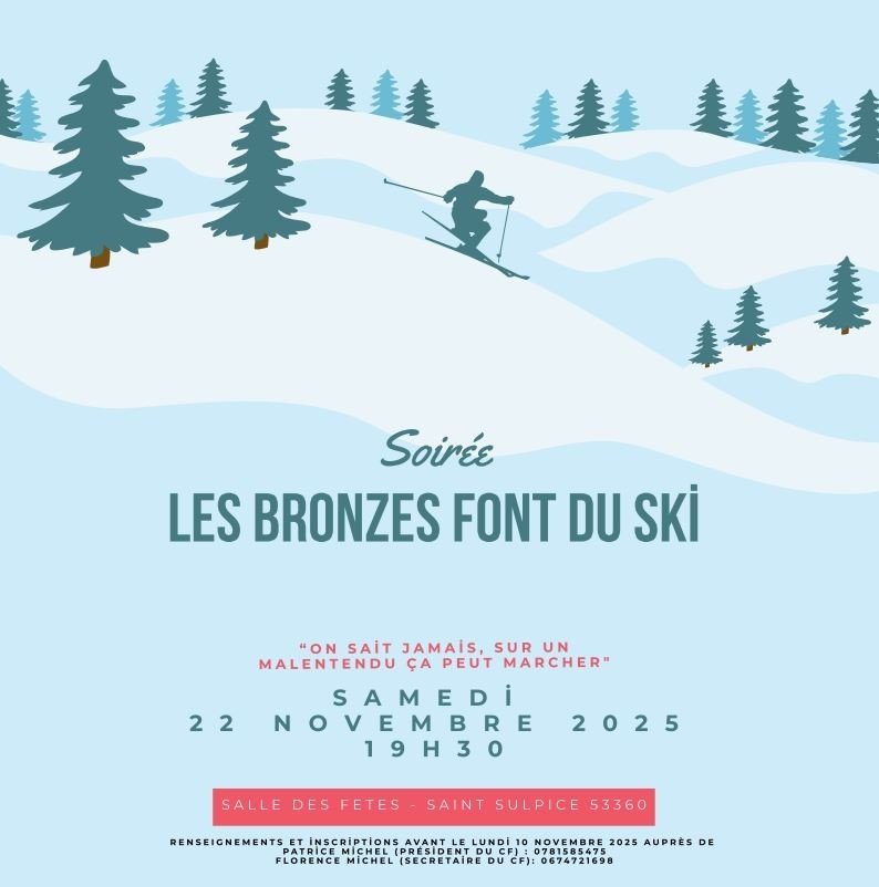 Le samedi 22 novembre 2025, le Comité des Fêtes vous invite à son repas annuel à la Salle des Fêtes de Saint-Sulpice, sur le thème culte du film "Les Bronzés font du Ski".