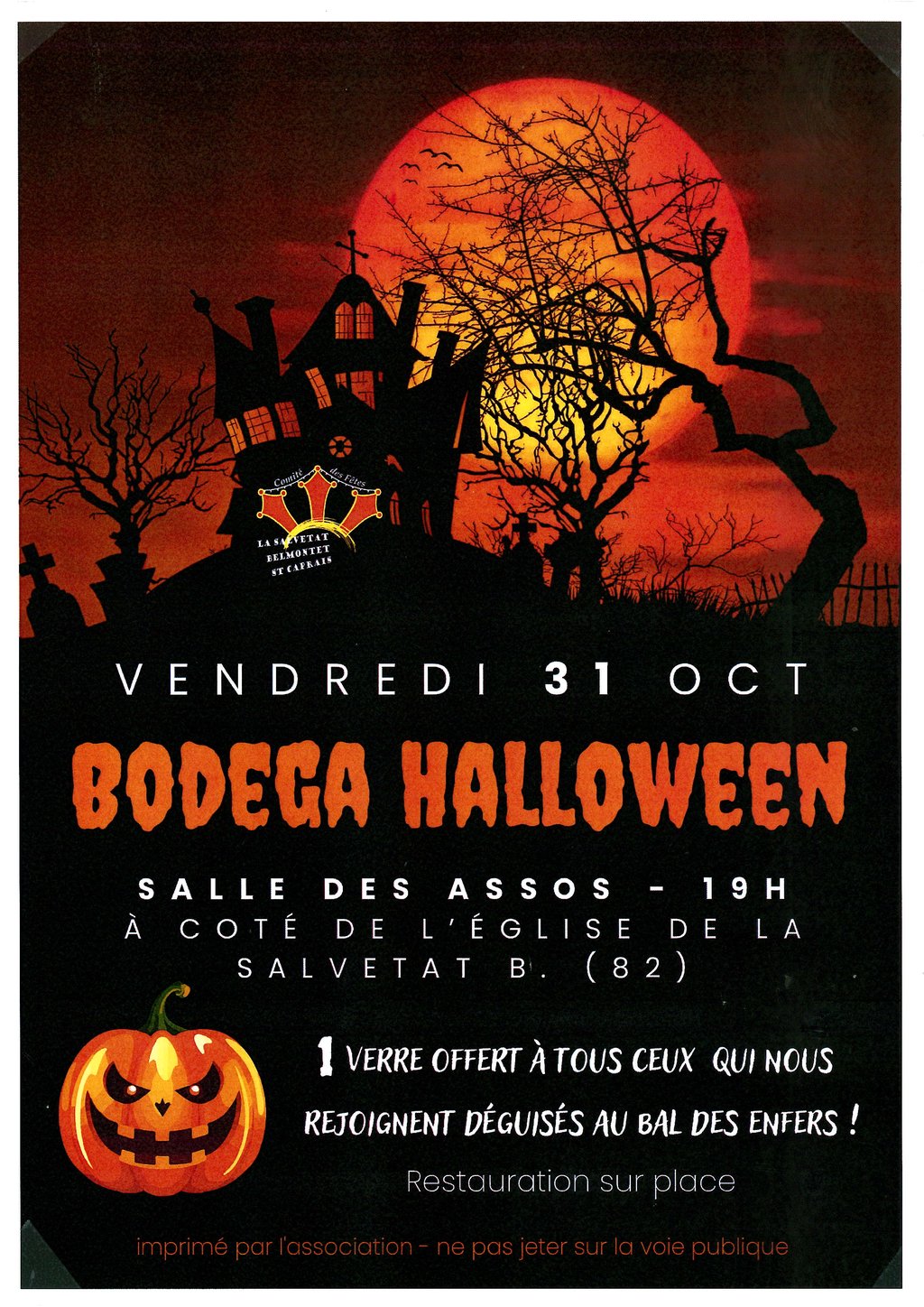 Le comité des fêtes vous convie pour une soirée Bodega Halloween le vendredi 31 octobre 2025 à la salle des associations de La Salvetat Belmontet (salle derrière l'église de La Salvetat)