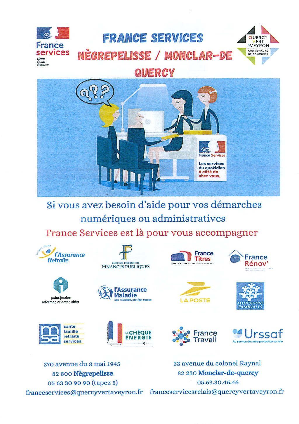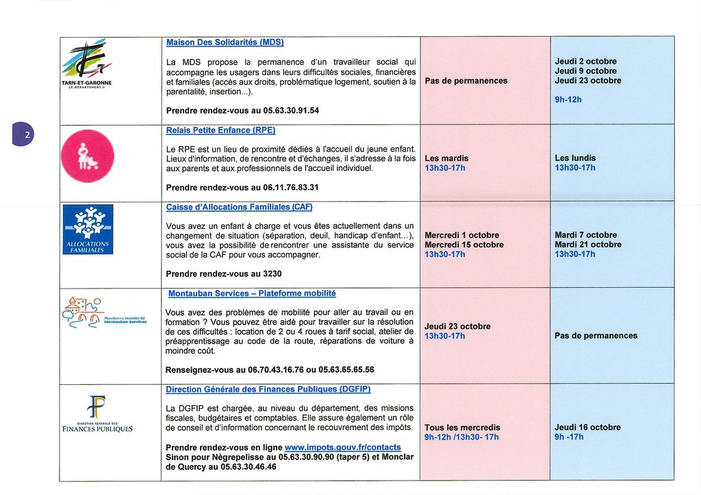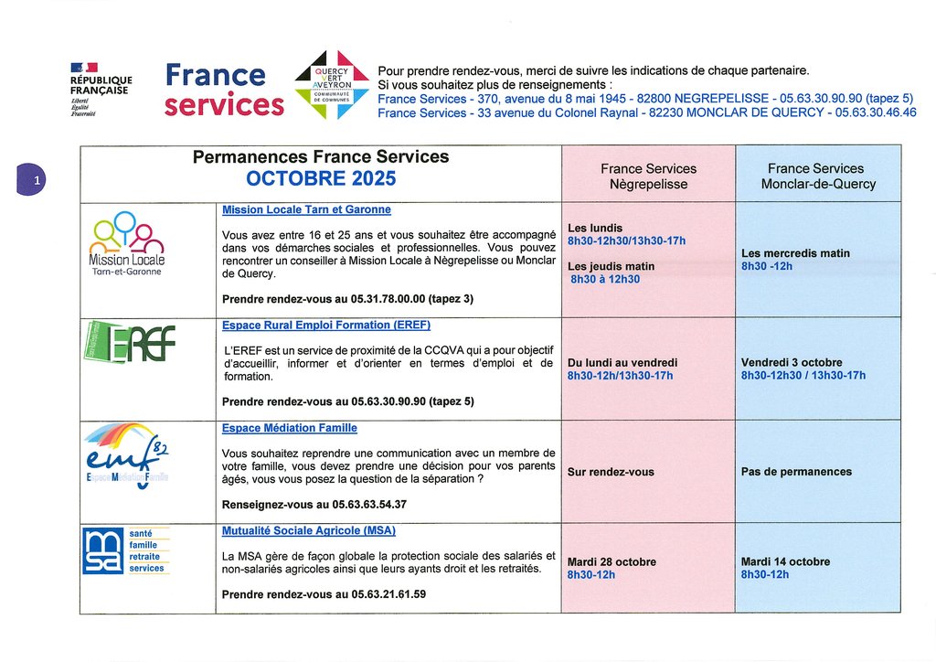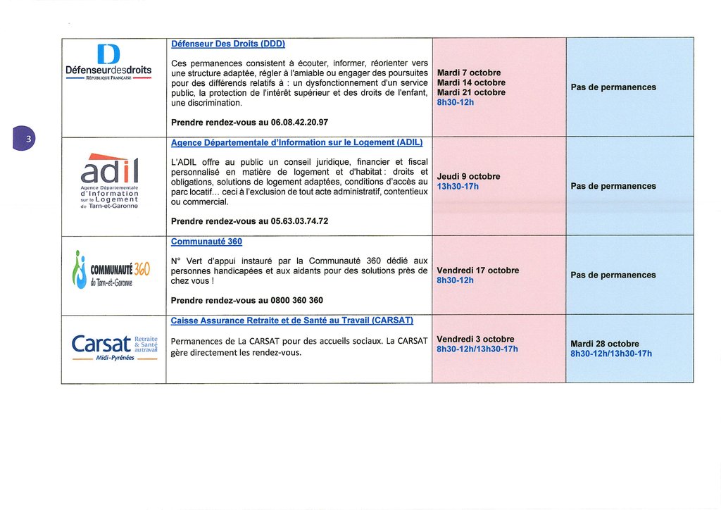 Les partenaires proposent également des permanences dans les locaux suivant un calendrier mensuel que vous pouvez retrouver sur le site de la Communauté des Communes Quercy vert Aveyron.