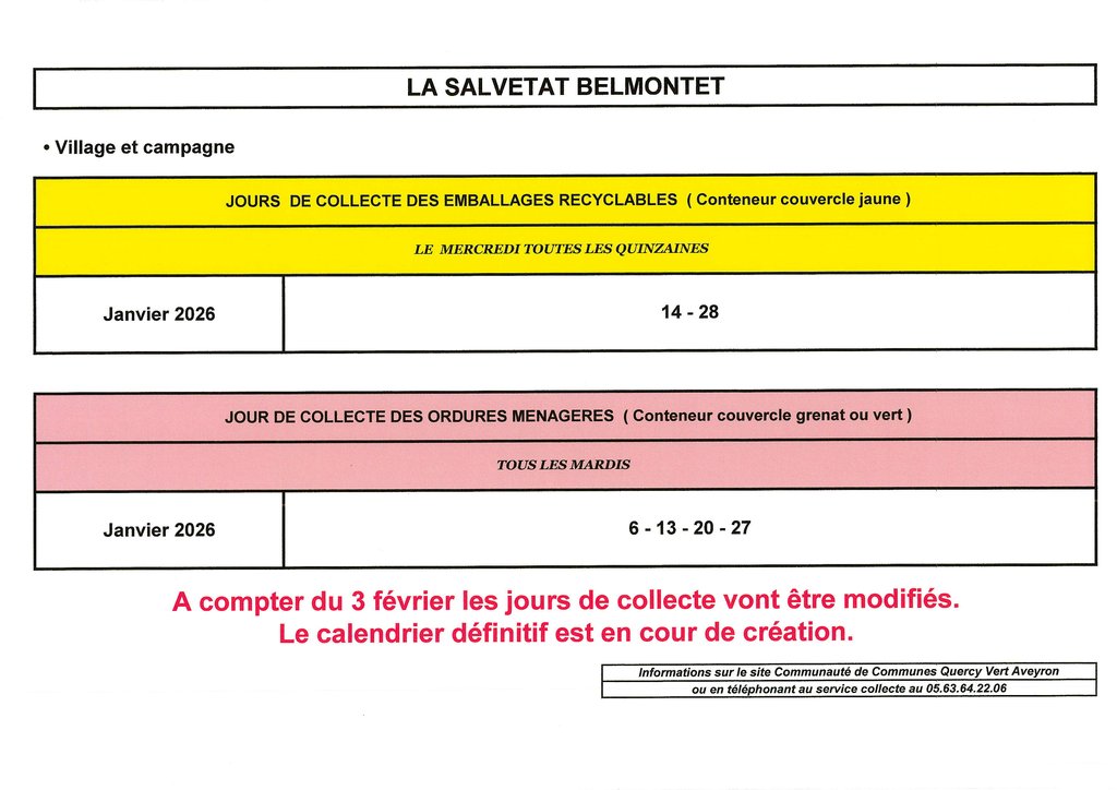 À compter du 3 février , les jours de collecte vont être modifiés, le calendrier définitif est en cours de création.