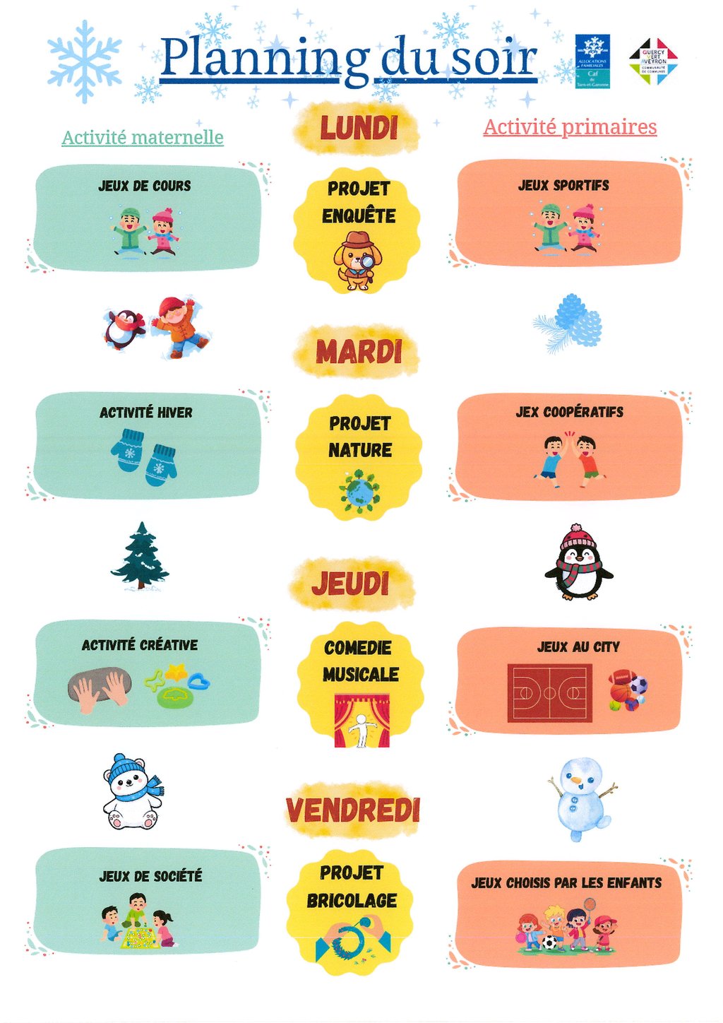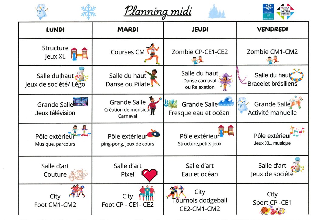 Planning des activités périscolaires pour la période janvier et février pour midi et soir à l'école de Belmontet.