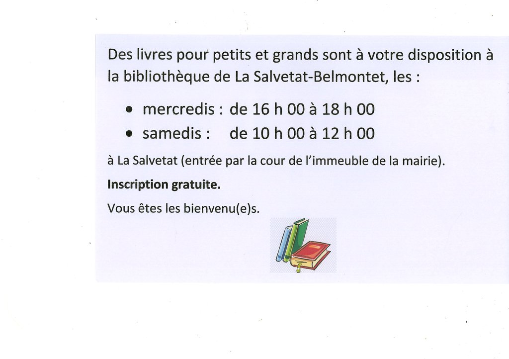 Pour rappel, la bibliothèque de La Salvetat Belmontet vous accueille tous les mercredis de 16h00à 18h00 et tous les samedis de 10h00 à 12h00.