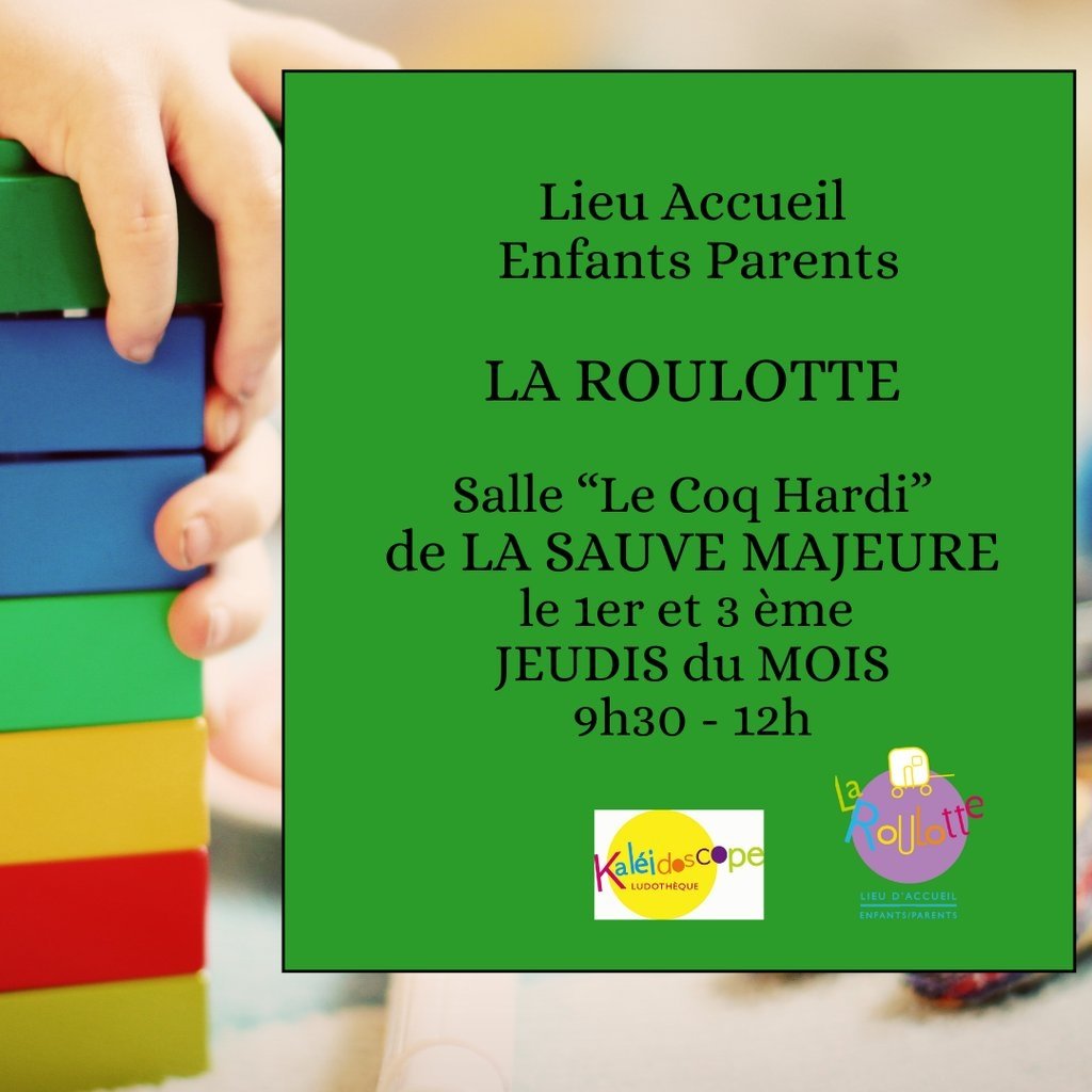 Le Lieu d'Accueil Enfants Parents "La Roulotte" se trouvera à La Sauve, à la salle du Coq Hardi (juste à côté de la mairie) le jeudi 18 décembre de 9h30 à 12h.