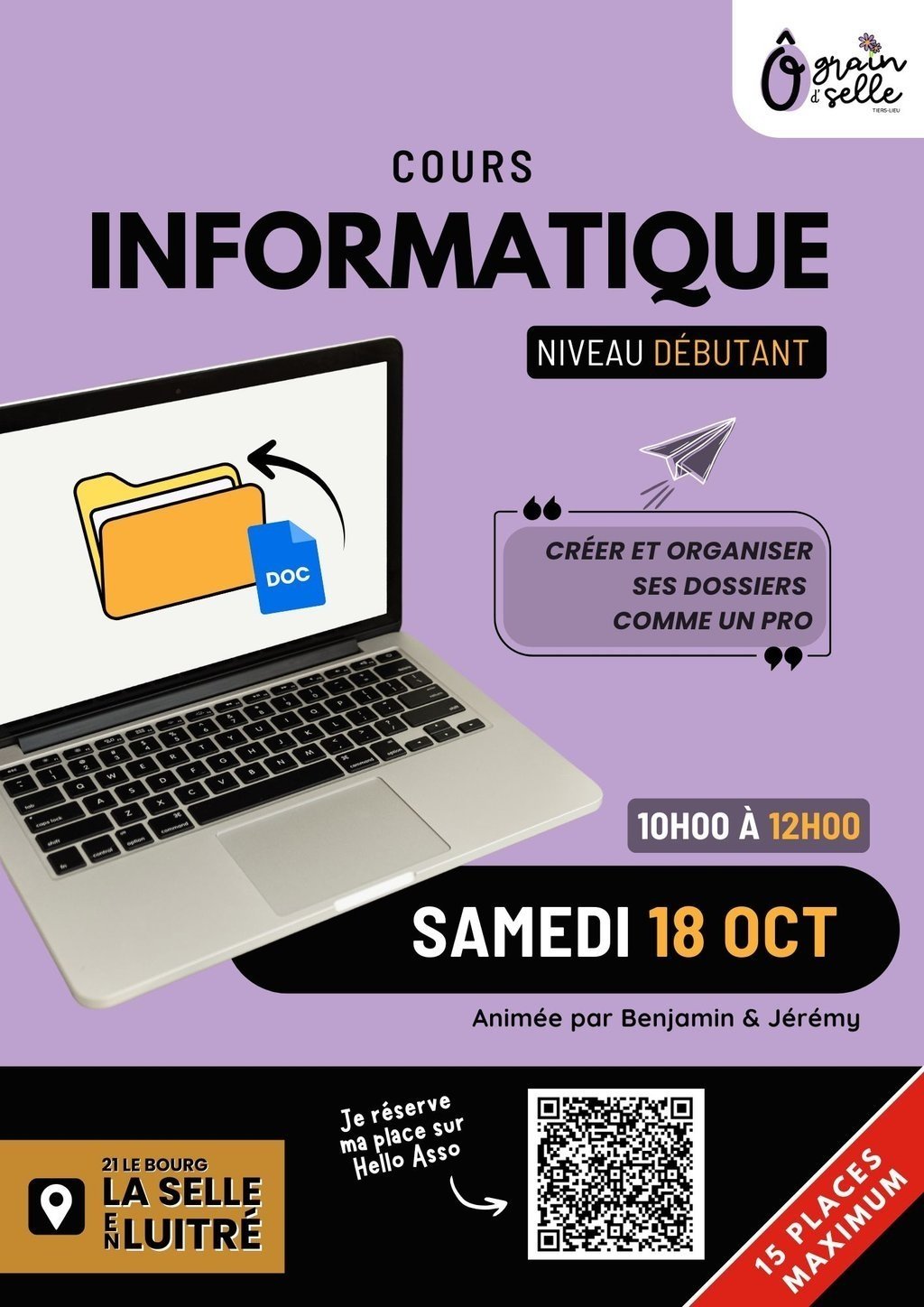 💻 Cours d’informatique pour tous ! Pour cette 7ᵉ session : nous allons découvrir comment créer et organiser ses dossiers comme un pro. Rendez-vous Samedi 18 Octobre de 10h00 à 12h00 au Tiers-lieu !