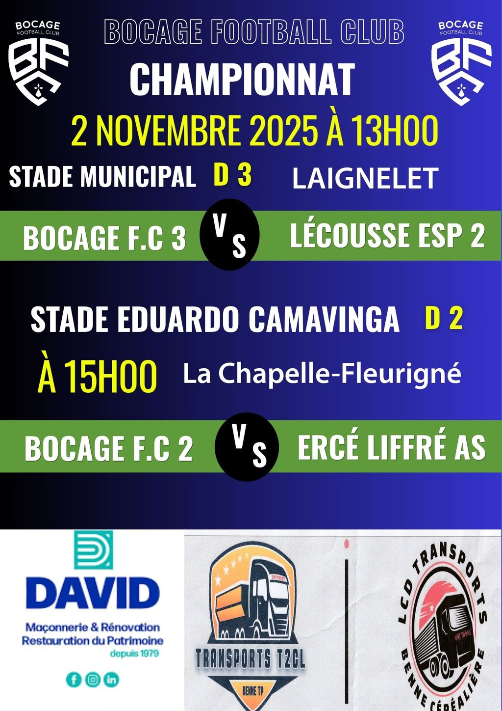 BOCAGE FOOTBALL CLUB - PROCHAINS MATCHS LE 2 NOVEMBRE