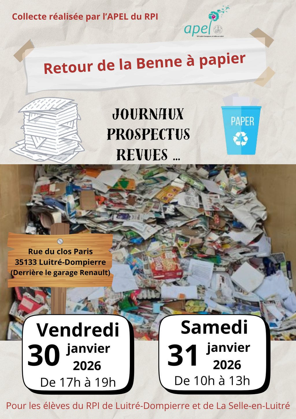 L’APEL vous donne rendez-vous ce vendredi 30 et samedi 31 pour la collecte de papier 🗓️