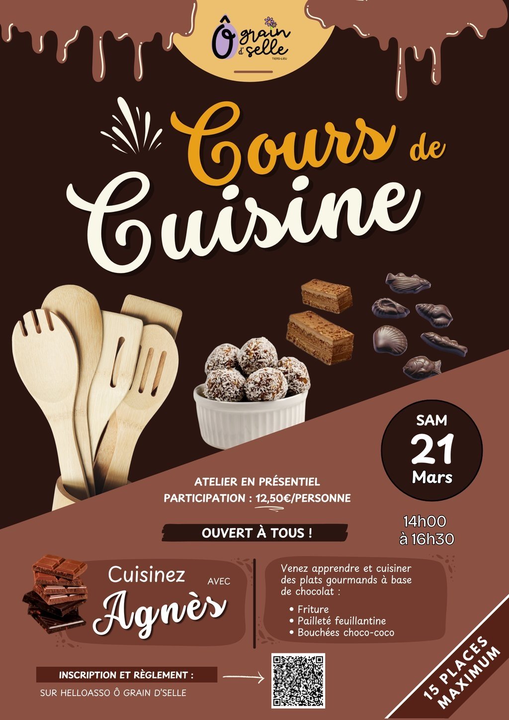 Infos et inscription sur HelloAsso : https://www.helloasso.com/associations/o-grain-d-selle/evenements/cours-de-cuisine-avec-agnes-4eme-atelier-atelier-chocolat