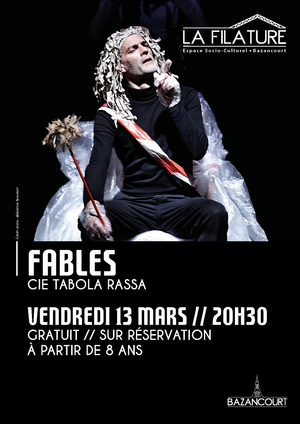 Cette création de la Compagnie Tabola Rassa met en scène 14 fables de Jean de La Fontaine. Au beau milieu de ce qui semble un ramassis fortuit de rebuts, deux comédiens font défiler sous nos yeux toute une clique d’animaux curieusement humains. D’un journal, d’un carton ou d’un sac en plastique, ils font surgir toute une galerie cocasse et étonnante où chaque personnage cache un animal et chaque animal… un homme.
