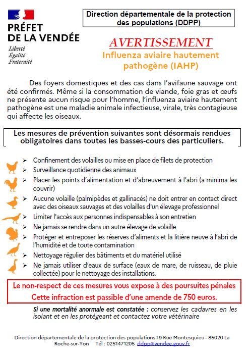 🔹 Le niveau de risque passe de « modéré » à « élevé » sur l’ensemble du territoire. Cette élévation s’appuie sur la multiplication de détection de cas hautement pathogène chez les oiseaux migrateurs. Il est observé également un passage de la maladie du compartiment sauvage au compartiment élevage. Le secteur du Marais Poitevin est actuellement très exposé. Aussi, il est demandé à l’ensemble des détenteurs d’oiseaux de basse-cour et d’ornement de respecter différents points, notamment :