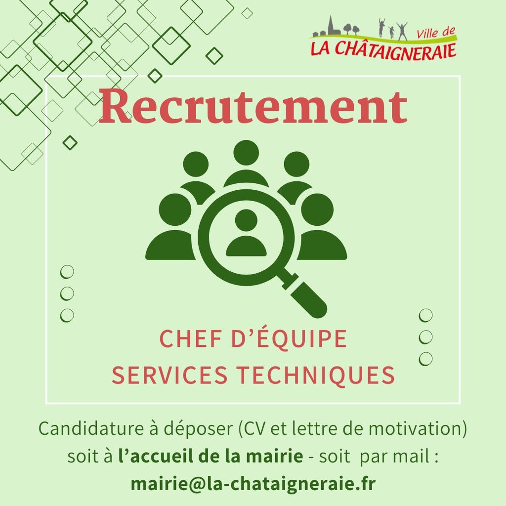 🔎 La commune de La Châtaigneraie recrute un chef d'équipe des services techniques (H/F) assurant la coordination des différents services (voirie, bâtiment, espaces verts).