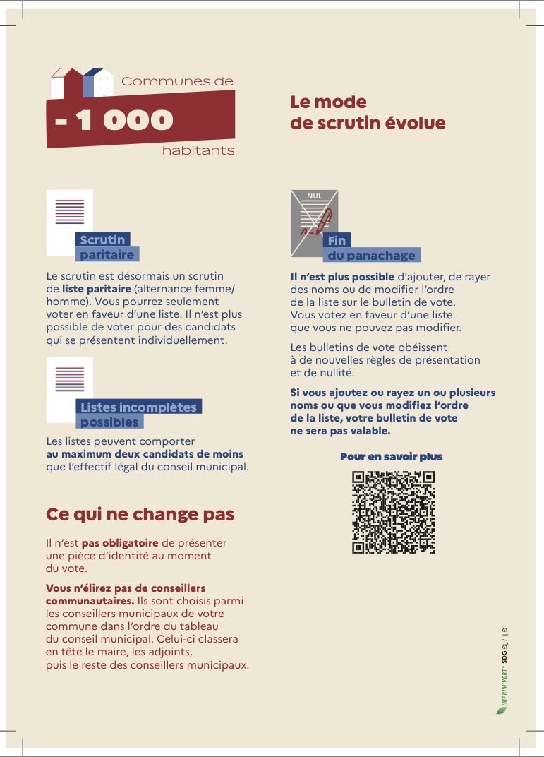 Les modalités électorales ont changé pour nos communes de moins de 1000 habitants et seront effectives aux élections municipales du 15 et 22 mars prochains.