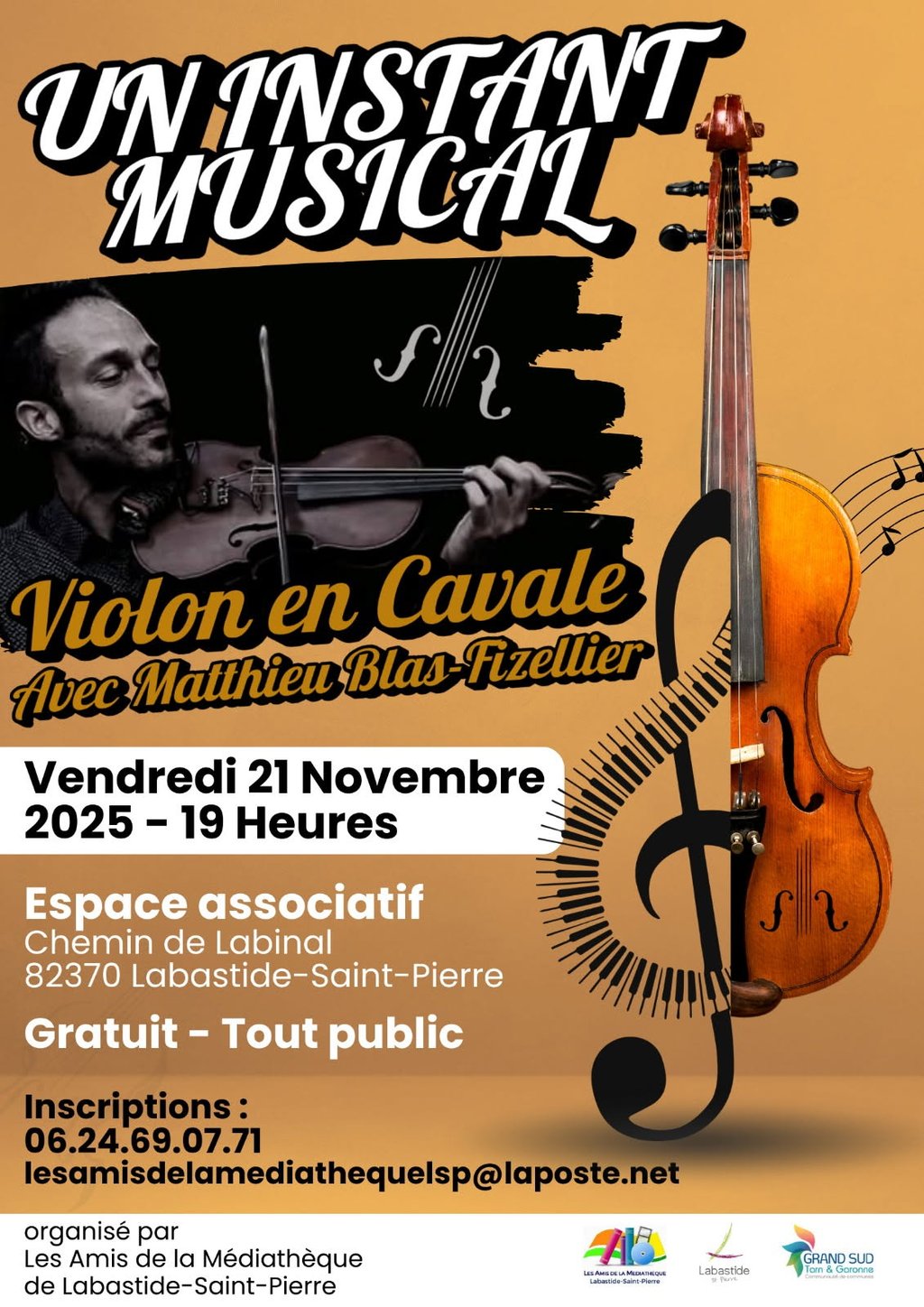 Le vendredi 21 novembre à l'Espace Associatif, Un instant musical propose Violon en cavale avec Mathieu Blas-Fizellier.