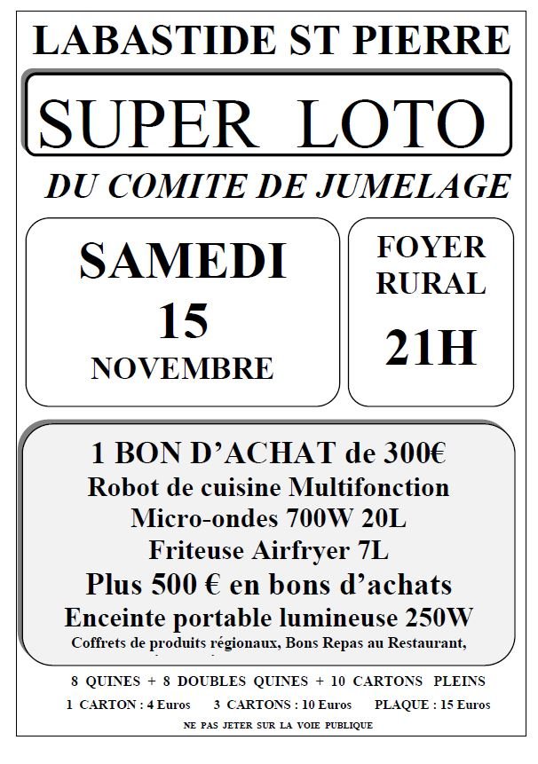 Rendez-vous le samedi 15 novembre à 21 H au Foyer Rural de Labastide-St-Pierre pour le grand loto du Jumelage.