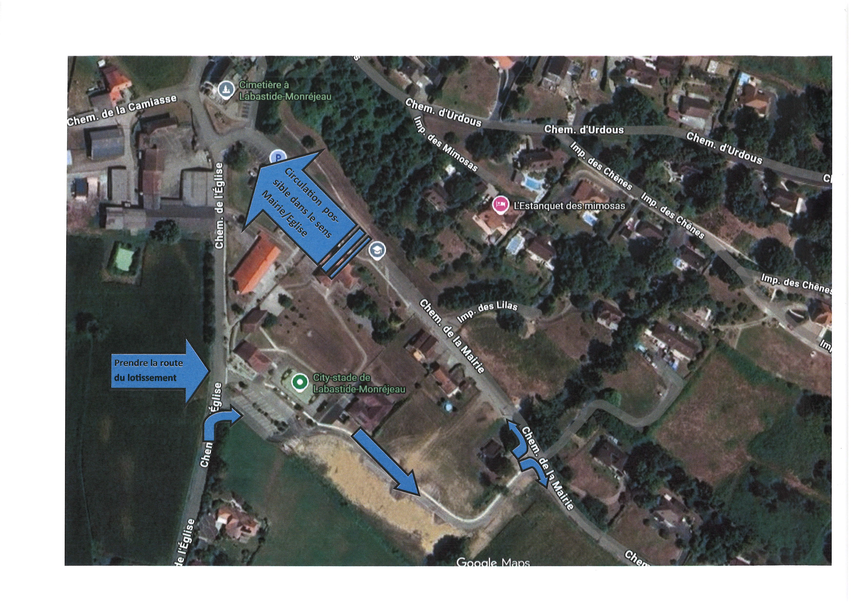 Pour les voitures arrivant depuis le bas du village, il faudra passer par le parking de l’école puis la route du lotissement pour rejoindre le chemin de la mairie.