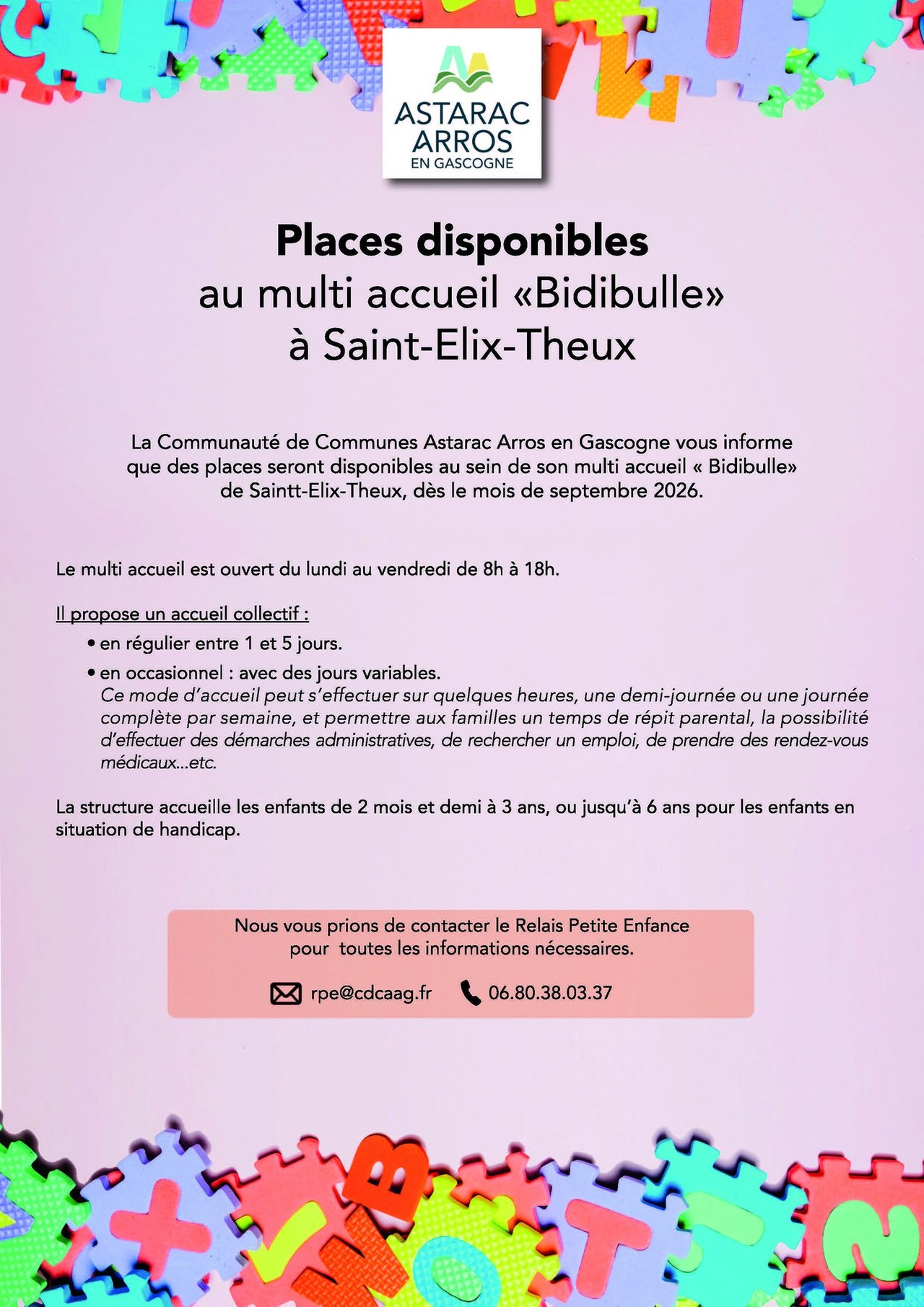 Des places seront disponibles à la crèche de St-Elix pour le mois de septembre. Vous pouvez déposez vos demandes d'inscription auprès du RPE avant 19 mars pour la prochaine commission d'attribution des places par mail rpe@cdcaag.fr ou 06.80.38.03.37