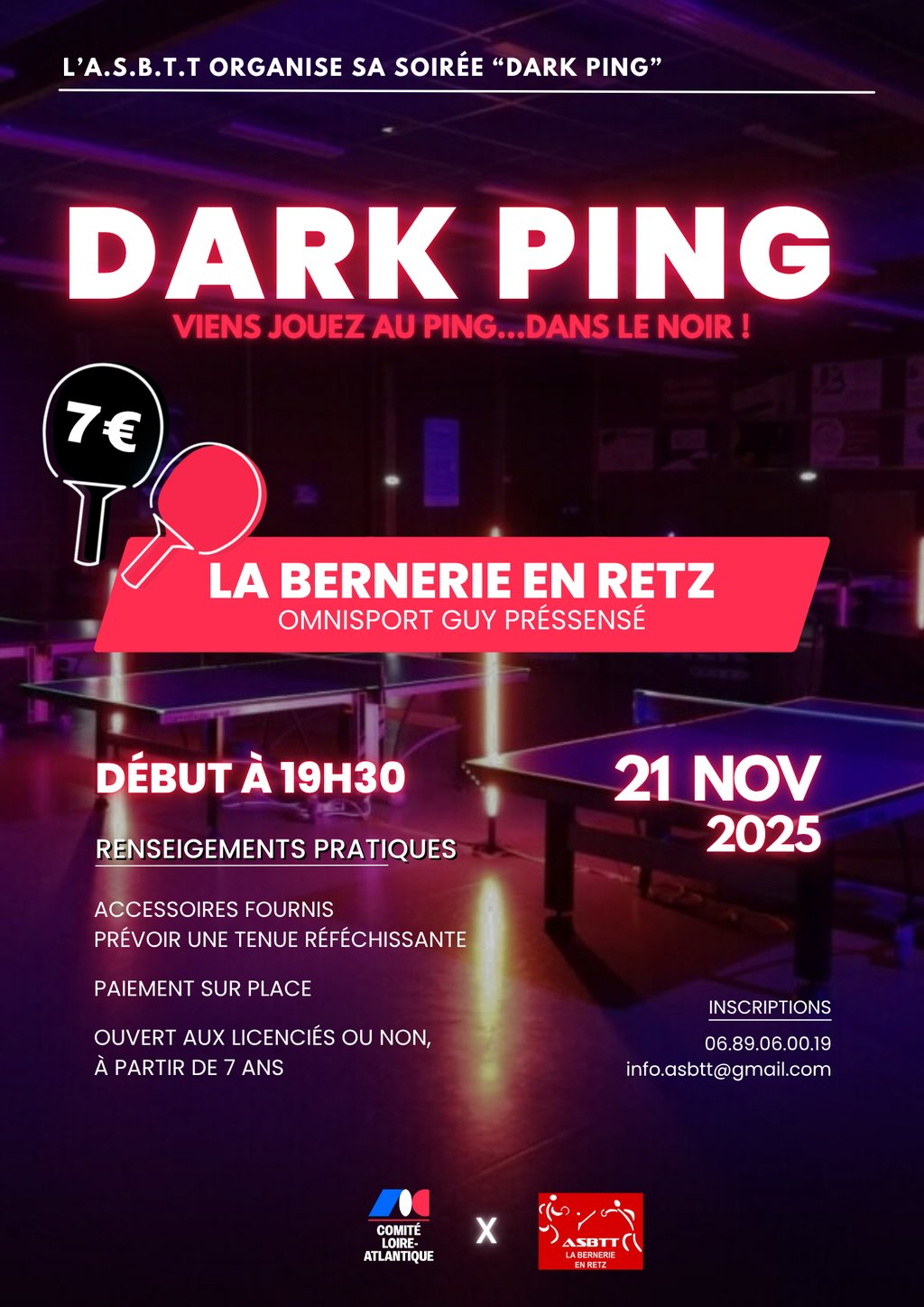 L'ASBTT organise une soirée "Dark ping" : venez jouer au ping... dans le noir, ouvert aux licenciés ou non à partir de 7 ans.