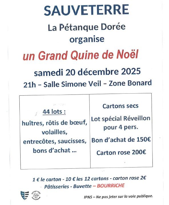 🎄✨ La Pétanque Dorée Sauveterrienne, en partenariat avec la Commune de Sauveterre-de-Guyenne, organise sa grande quine de Noël le samedi 20 décembre 2025 à 21h, à la salle Simone Veil.