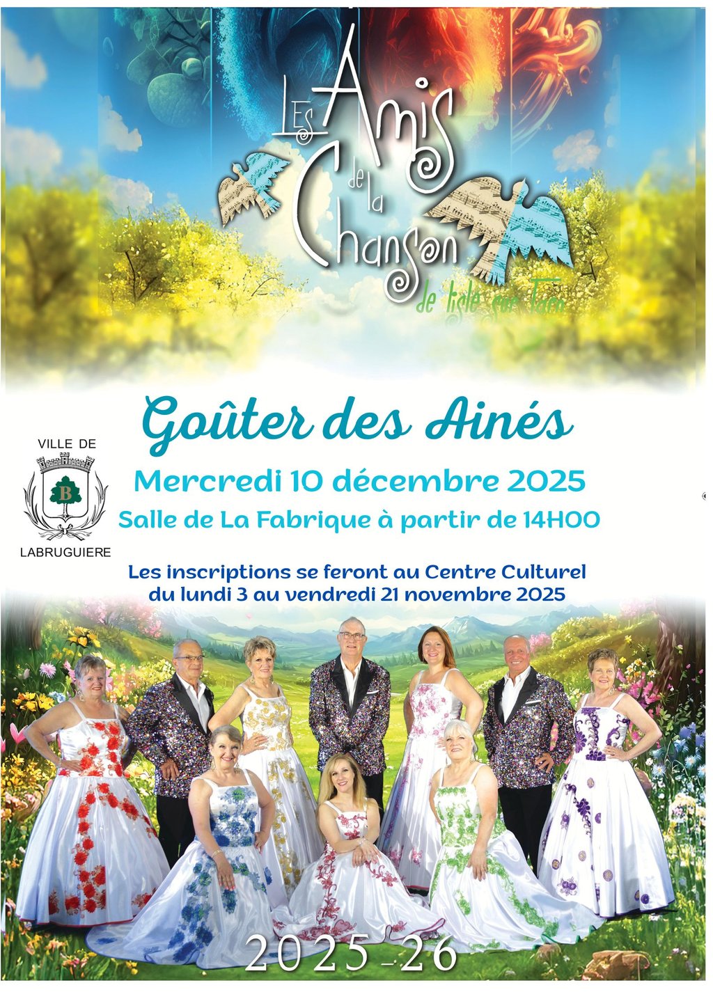 🎶 La Mairie de Labruguière convie chaleureusement les seniors de la commune au traditionnel Goûter des Aînés, animé par Les Amis de la Chanson le mercredi 10 décembre à la Fabrique, à 14h 🎤