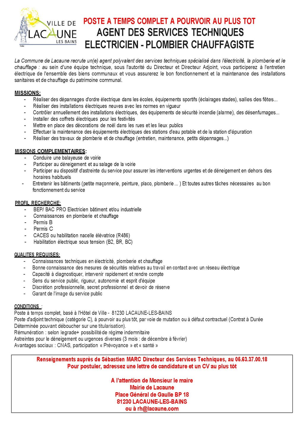 => Candidatures : à transmettre à l'attention de Monsieur le Maire à rh@lacaune.com ou à Mairie de Lacaune, BP 18 Place Général de Gaulle, 81230 Lacaune-les-bains