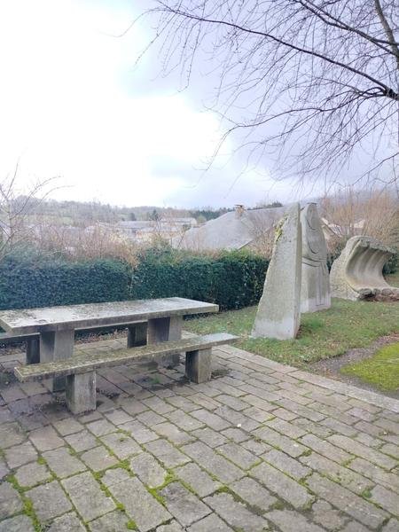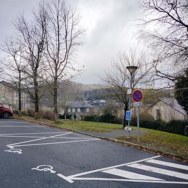 Aire ombragée à proximité d'un parking, munie de toilettes et d'un change-bébé.