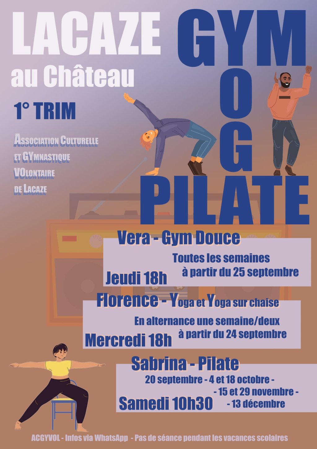 Pour garder la pêche 🍑, cette année l'association ACGYVOL a le privilège de bénéficier de cours de Pilates avec Sabrina (1 samedi sur 2 à 10 h 30), des cours de Gym Douce avec Véra (tous les jeudis à 18 h 00) ainsi que des cours de Yoga (Hatha) et Yoga sur Chaise (tous les mercredis à 18 h 00 par alternance) avec Florence.