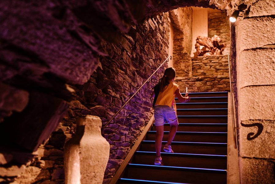 Pour les enfants, l'équipement du chevalier (chasuble, bouclier et épée) est prêté pour la visite du château et du village