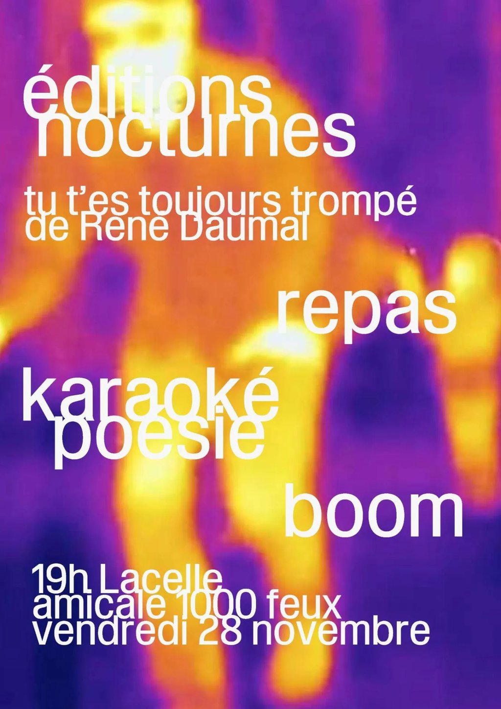 Écrit à dix-huit ans, « Tu t’es toujours trompé » est le cri de rage d’un jeune homme qui refuse le mensonge du monde. Chez René Daumal, la révolte n’est pas un geste politique, mais une nécessité vitale : celle de s’affranchir de tous les « systèmes clos d’abstraction » pour rendre à la pensée sa force brute, son ancrage dans le corps, dans la vie, dans l’expérience. À la frontière de l’essai et de la poésie, ce texte incandescent fait voler en éclats les conventions intellectuelles et les catégories étouffantes de la société. Chaque phrase semble jaillir du refus, de la lucidité, du désir de voir clair là où tout s’embrouille. Jamais publié du vivant de Daumal — poète, mystique et cofondateur du Grand Jeu —, ce texte nous parvient un siècle plus tard avec la même urgence. Brûlant d’actualité, il nous rappelle que penser, c’est d’abord refuser. Les éditions nocturnes est une toute jeune maison d’édition basée sur Eymoutiers. Tu t’es toujours trompé est leur premier livre. Cette soirée sera aussi l’occasion de présenter et d’échanger autour de ce nouveau projet éditorial.