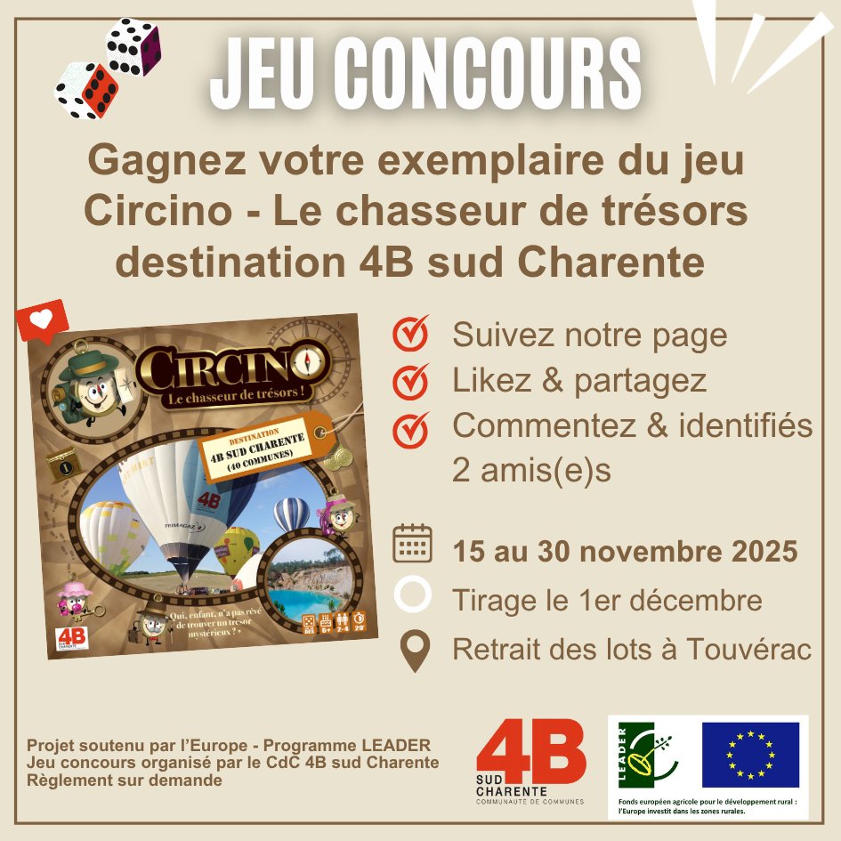 La Communauté de Communes 4B sud Charente est heureuse d’annoncer la sortie de son propre jeu de plateau : Circino, le Chasseur de trésors – Destination CdC 4B sud Charente.