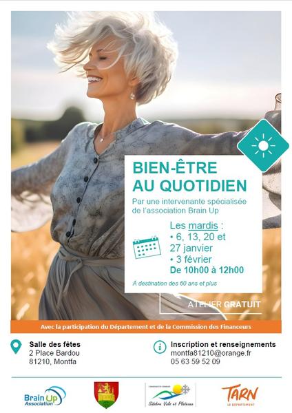 La mairie de Montfa et la communauté de communes Sidobre Vals et Plateaux en partenariat avec l'association Brain Up vous proposent de venir à ces 5 séances qui seront animées par un professionnel en psychologie. Ce sera l'occasion d'échanger sur l'équilibre entre le bien-être mental et physique. Venez nombreux pour partager vos expériences