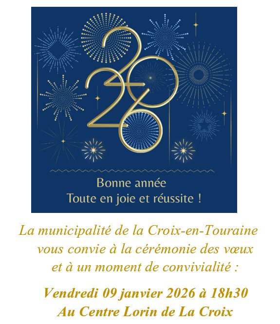 La municipalité à le plaisir de convier l’ensemble des habitants pour assister à la cérémonie des vœux, qui se tiendra le vendredi 9 janvier à 18h30 au Centre Lorin de La Croix (salle des fêtes).