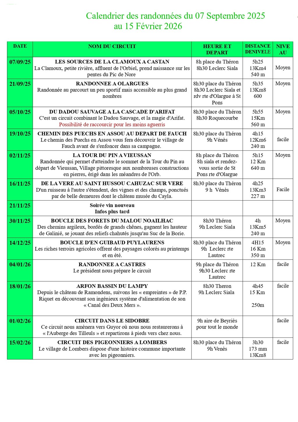 Calendrier des randonnées allant du 7 septembre 2025 au 15 février 2026