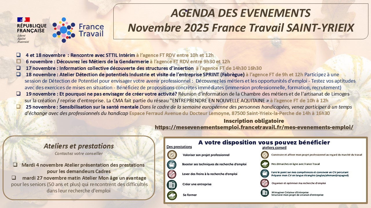 AGENDA ÉVÉNEMENTS NOVEMBRE 2025 – FRANCE TRAVAIL SAINT-YRIEIX