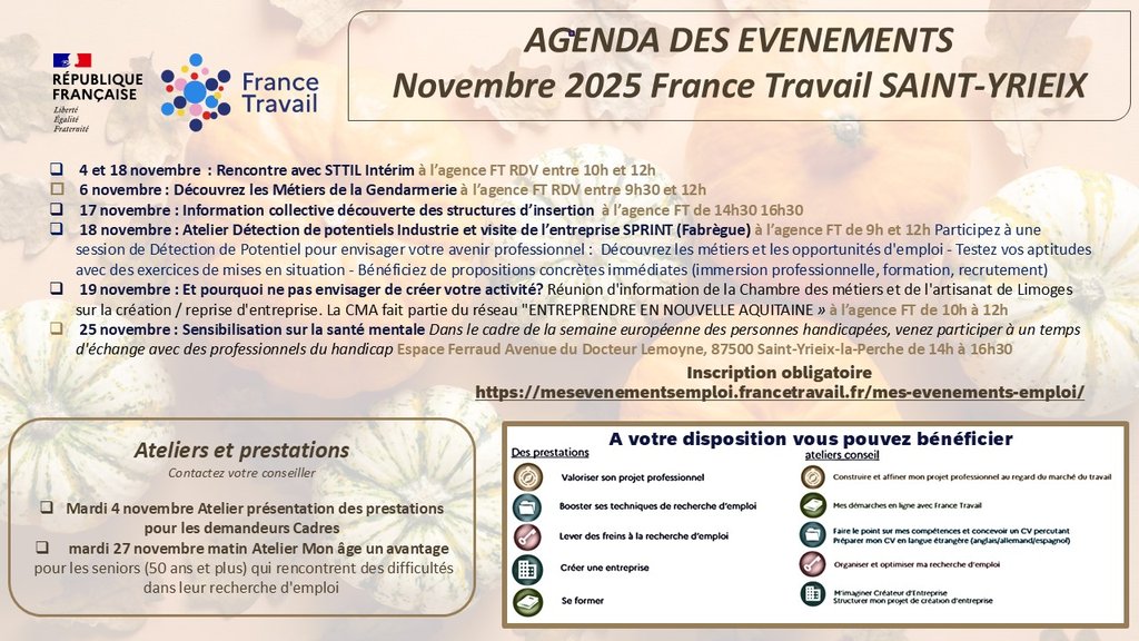 Voici les événements proposés par l'Agence France Travail de Saint-Yrieix pour le mois de novembre