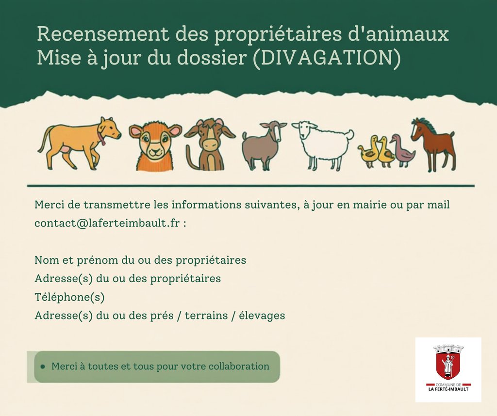 đŁ RECENSEMENT DES PROPRIĂTAIRES DâANIMAUX â MISE Ă JOUR DU DOSSIER âDIVAGATIONâ AUPRĂS DE LA GENDARMERIE.