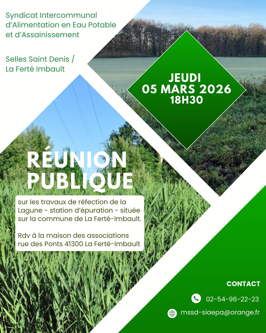Le Syndicat Intercommunal d’Alimentation en Eau Potable et d’Assainissement Selles-Saint-Denis / La Ferté-Imbault vous invite à une réunion publique consacrée aux travaux de réfection de la lagune – station d’épuration, située sur la commune de La Ferté-Imbault.