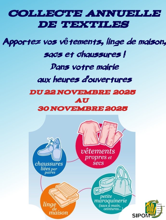 Dans le cadre de son engagement en faveur de la réduction des déchets, le SIPOM organise une collecte évènementielle de textiles ouverte à tous les habitants. Cette action solidaire et éco-responsable aura lieu du 22 au 30 novembre 2025 dans votre mairie pendant les heures d’ouvertures.