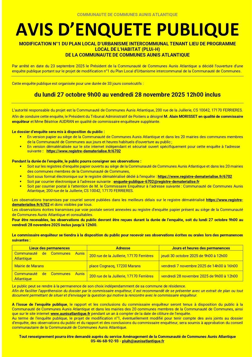 AVIS D'ENQUETE PUBLIQUE MODIFICATION N°1 DU PLAN LOCAL D'URBANISME INTERCOMMUNAL TENANT LIEU DE PROGRAMME LOCAL DE L'HABITAT (PLUI-H) DE LA COMMUNAUTE DE COMMUNES AUNIS ATLANTIQUE