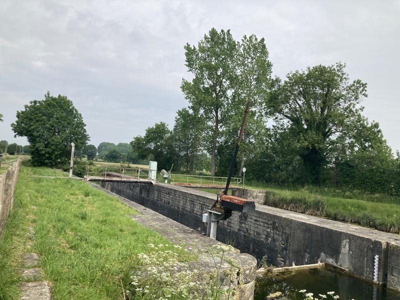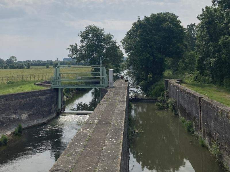 L'écluse de Sazay régule le flux du Canal du Mignon avec une pelle qui retient partiellement l'eau.