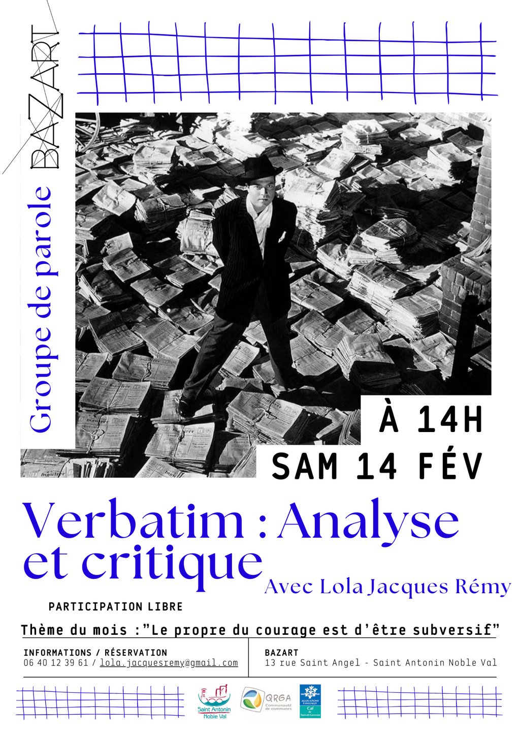 Pour chaque rencontre un participant proposera un verbatim qu'il aura pioché sur les réseaux sociaux, dans un magazine, dans un journal. Nous le mettrons en perspective grâce à des outils théoriques, philosophiques. Ces rencontres auront lieu un samedi après-midi par mois.