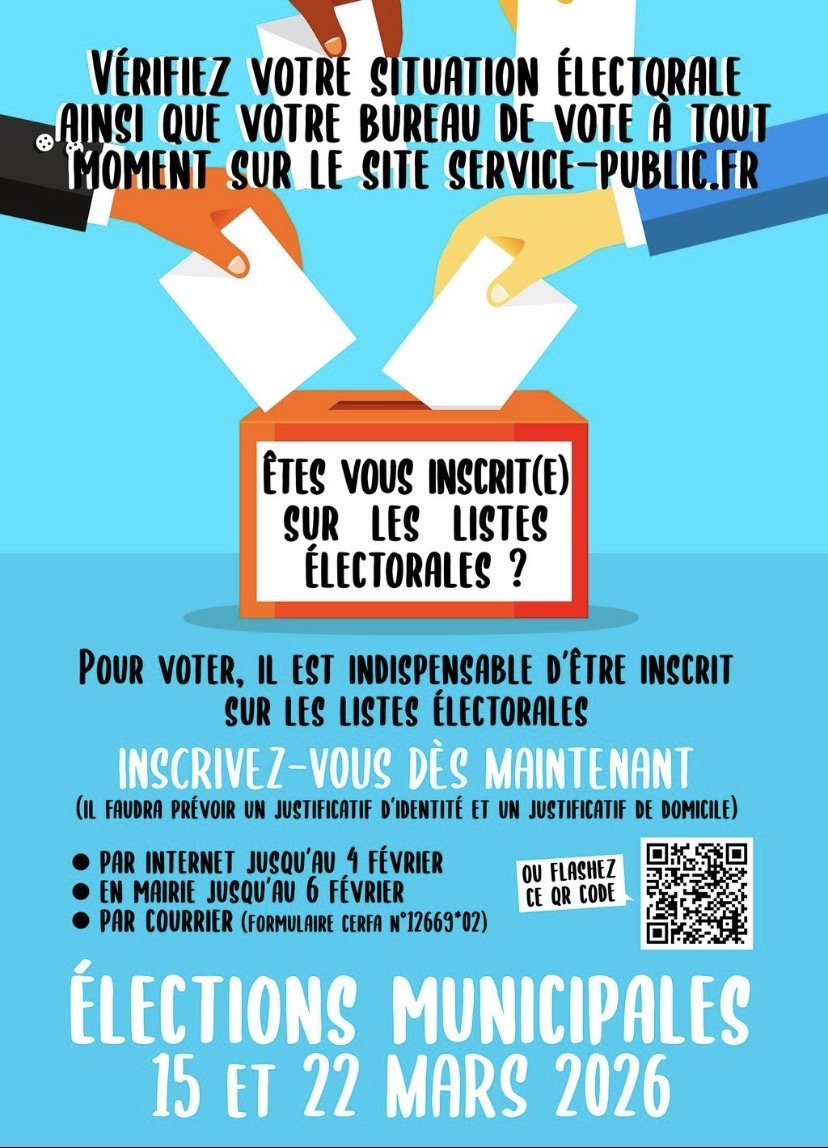- jusqu'au 4 février 2026 en ligne sur le site du service public : Demande d'inscription en ligne sur les listes électorales - Service Public