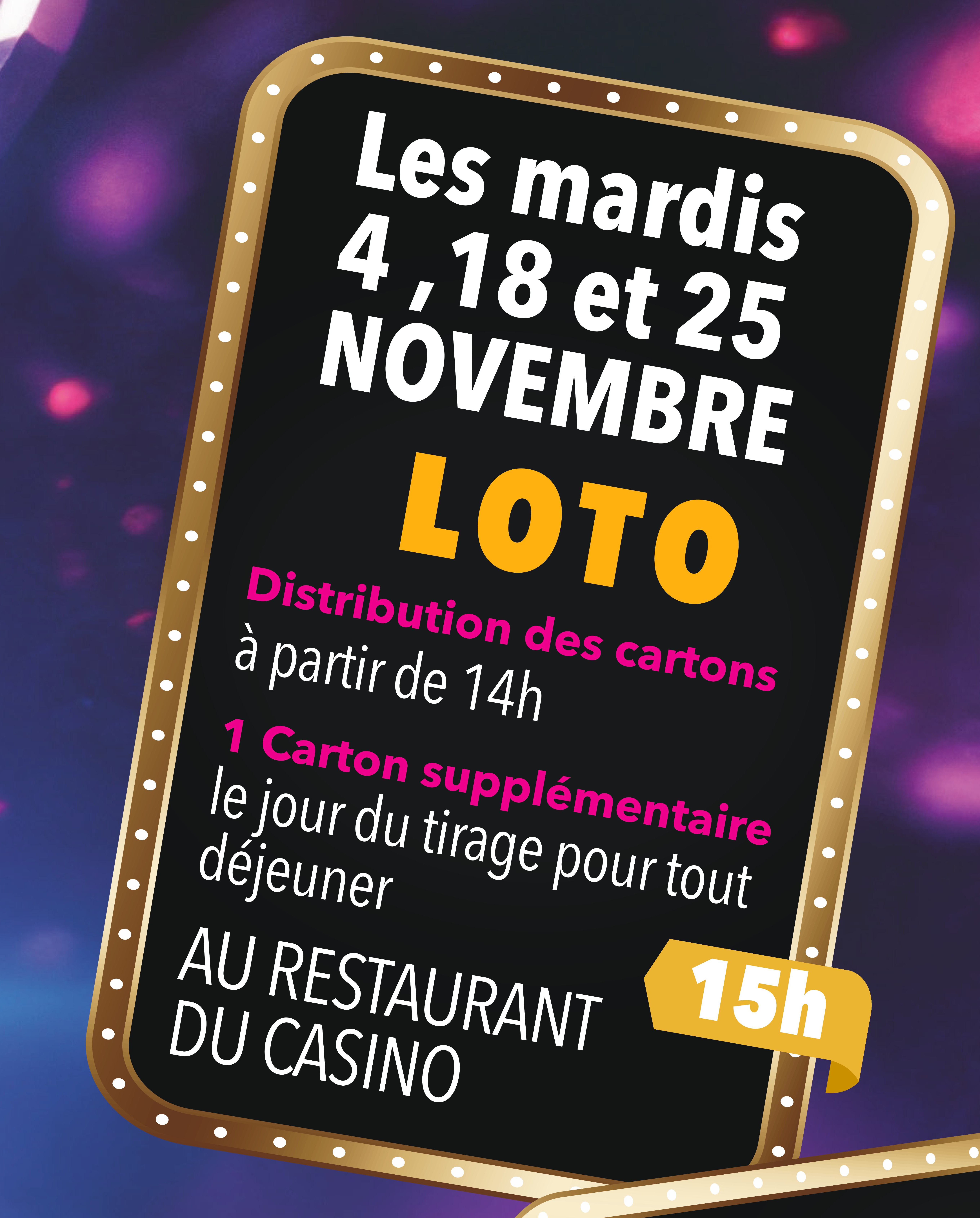 Distribution des cartons à partir de 14h, début du loto à 15 h. 1 carton supplémentaire pour tout déjeuner au Restaurant du Casino le jour du tirage du loto.