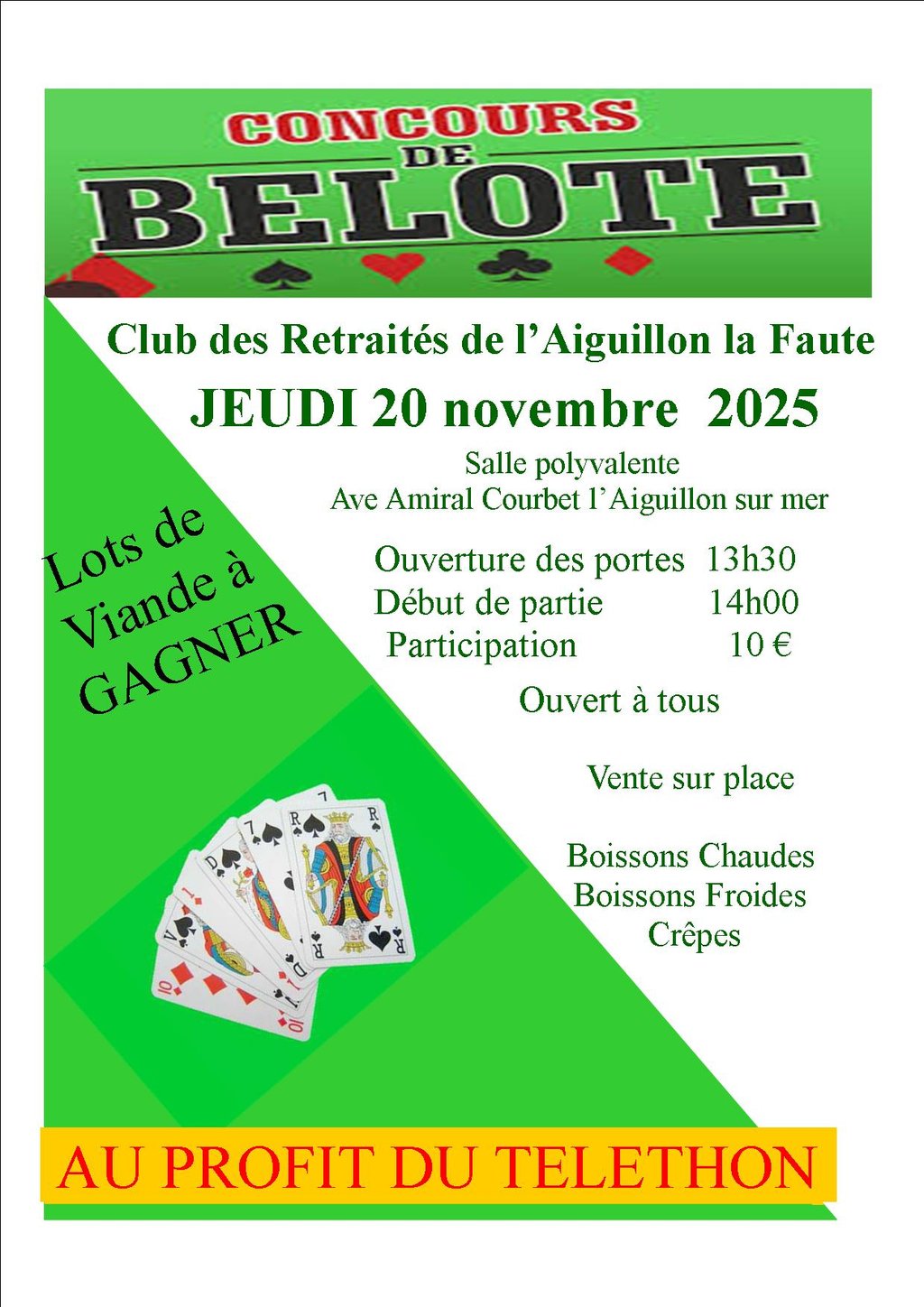 Concours de belote le 20 novembre ,salle Maurice Milcent à l’Aiguillon sur mer.