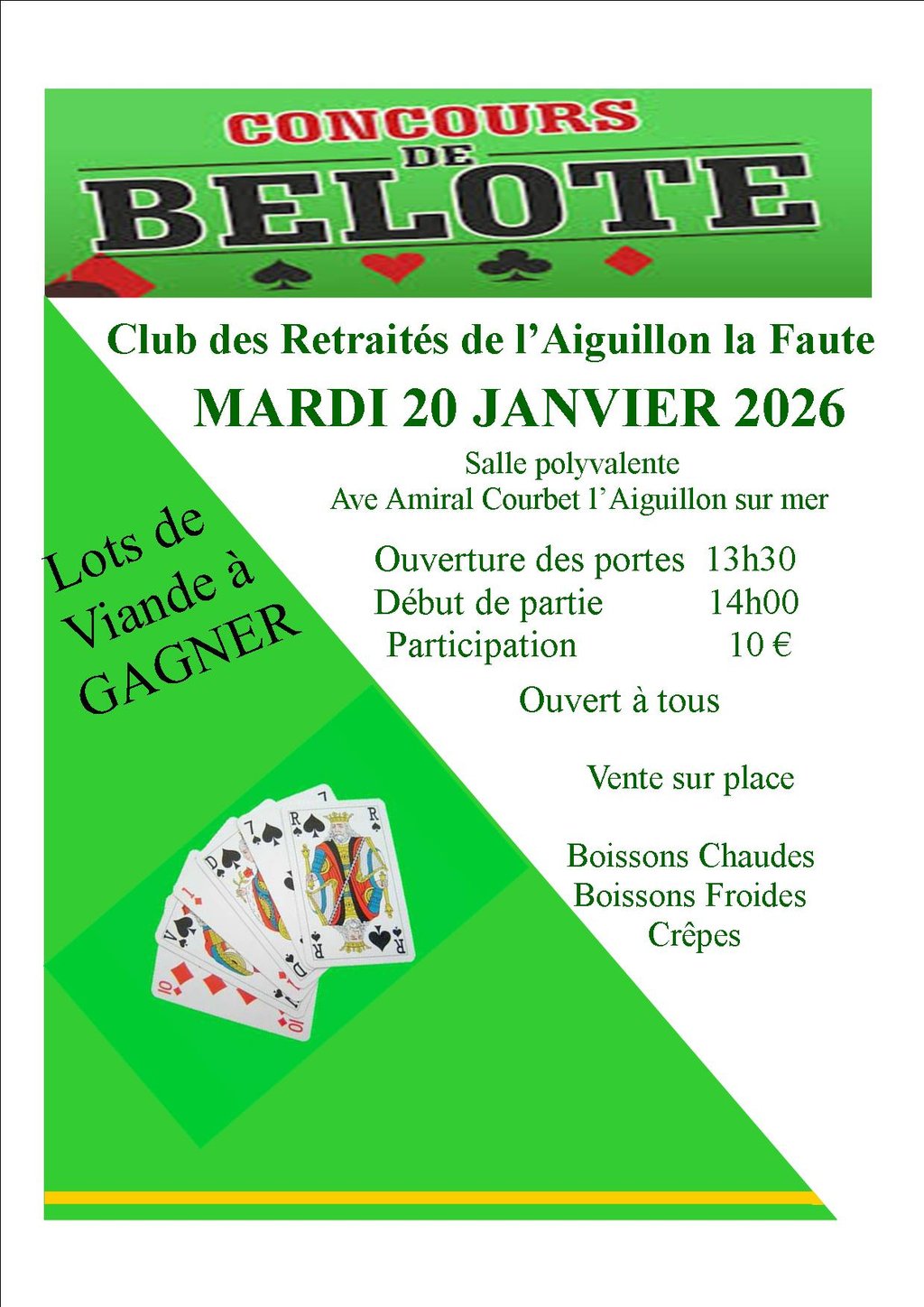 Le mardi 20 janvier salle Maurice Milcent à l’Aiguillon sur mer. Lots de viande à gagner.