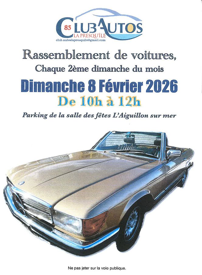 Le club autos La Presqu'île vous convie à son rassemblement de voitures le dimanche 8 février de 10h00 à 12h00 parking de la salle M.Milcentà L'Aiguillon-sur-Mer
