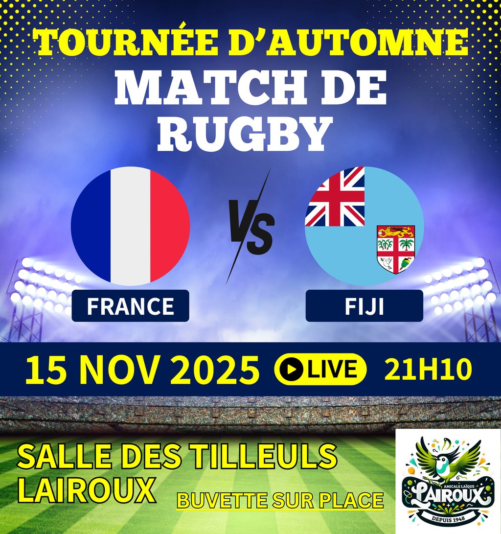 📅 Samedi 15 novembre, retrouvez-nous à la Salle des Tilleuls à Lairoux pour vivre en direct le 2ᵉ match de la tournée d’automne : France 🇫🇷 – Fidji 🏴 sur grand écran 📺 !
